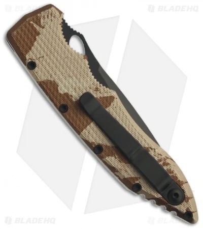 This Mini Predator has a desert camo anodized aluminum handle with tactical hardware and a titanium pocket clip. The blade is black finished with a partially serrated edge.